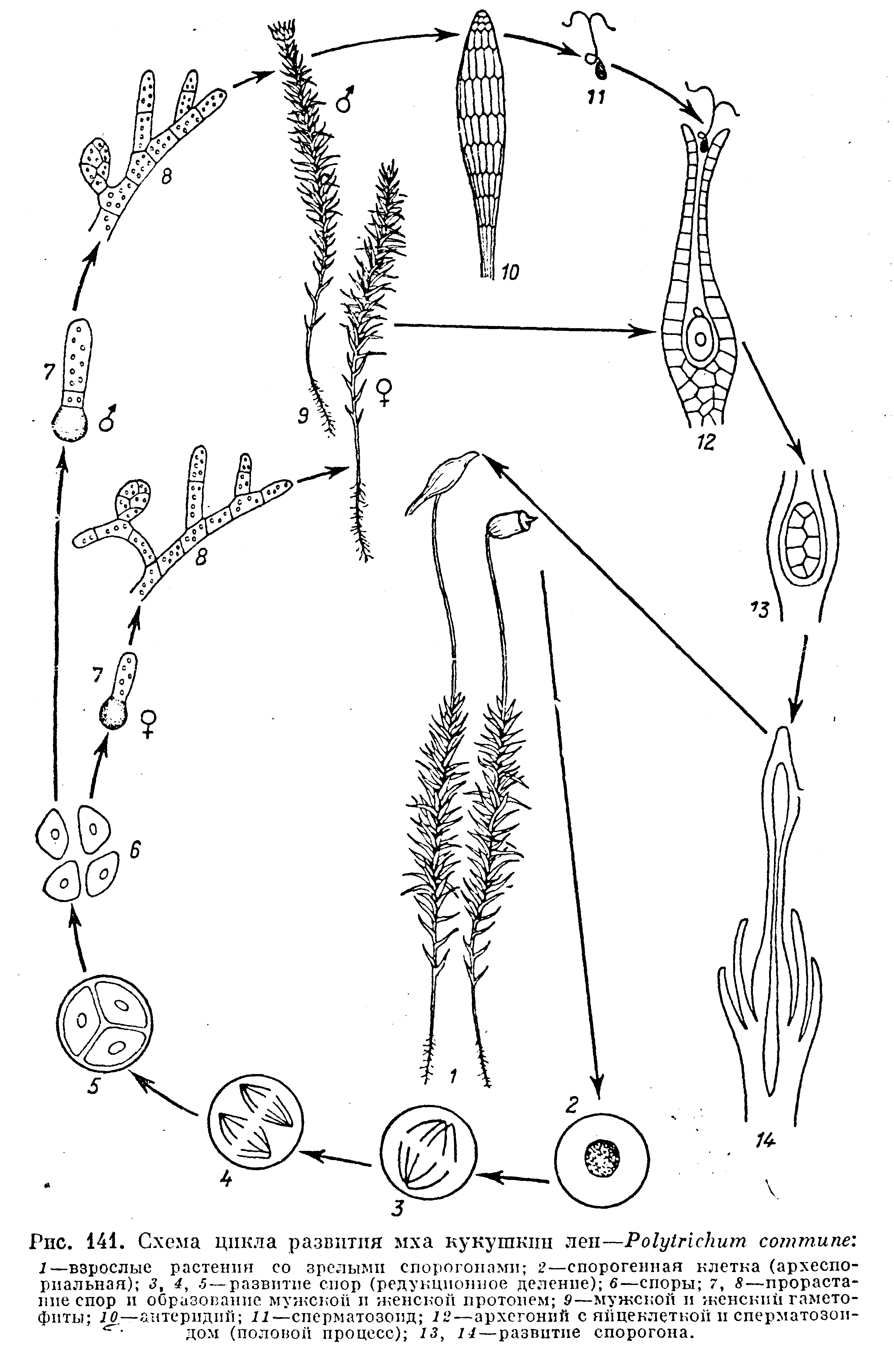 Рассмотрим цикл развития мохообразных на примере мха Кукушкин лен. (см. рис. 2 и схему на стр. 9)