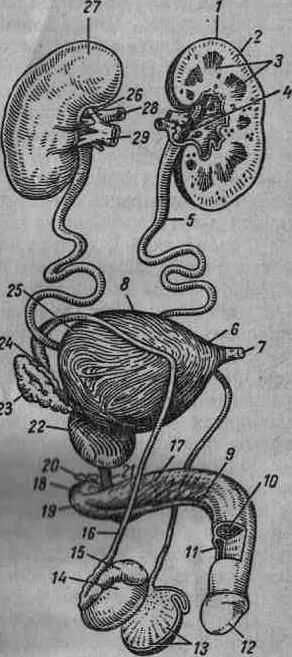 Рис. . Мочеполовой аппарат мужчины (полусхематично). 1—левая почка; 2—корковое вещество почки; 3—мозговое вещество почки; 4—почечная лоханка; 5—левый мочеточник; 6—верхушка мочевого пузыря; 7—пузырно-пупочная связка (остаток мочевого протока зародыша); 8—тело мочевого пузыря; 9—губчатое тело полового члена; 10—пещеристое тело полового члена; 11—губчатая часть мочеиспускательного канала; 12—головка полового члена; 13—дольки яичка; 14—яичко; 15—придаток яичка; 16—семявыносящий проток; 17— седалищно-пещеристая мышца; 18— луковица полового члена: 19— луковично-губчатая мышца; 20— бульбоуретральная железа; 21 — перепончатая часть мочеиспускательного канала: 22— предстательная железа; 23— семенной пузырек; 24—ампула семявыносящего протока; 25—дно мочевого пузыря; 26—правая почка; 27— ворота почки; 28—почечная артерия; 29—почечная вена.