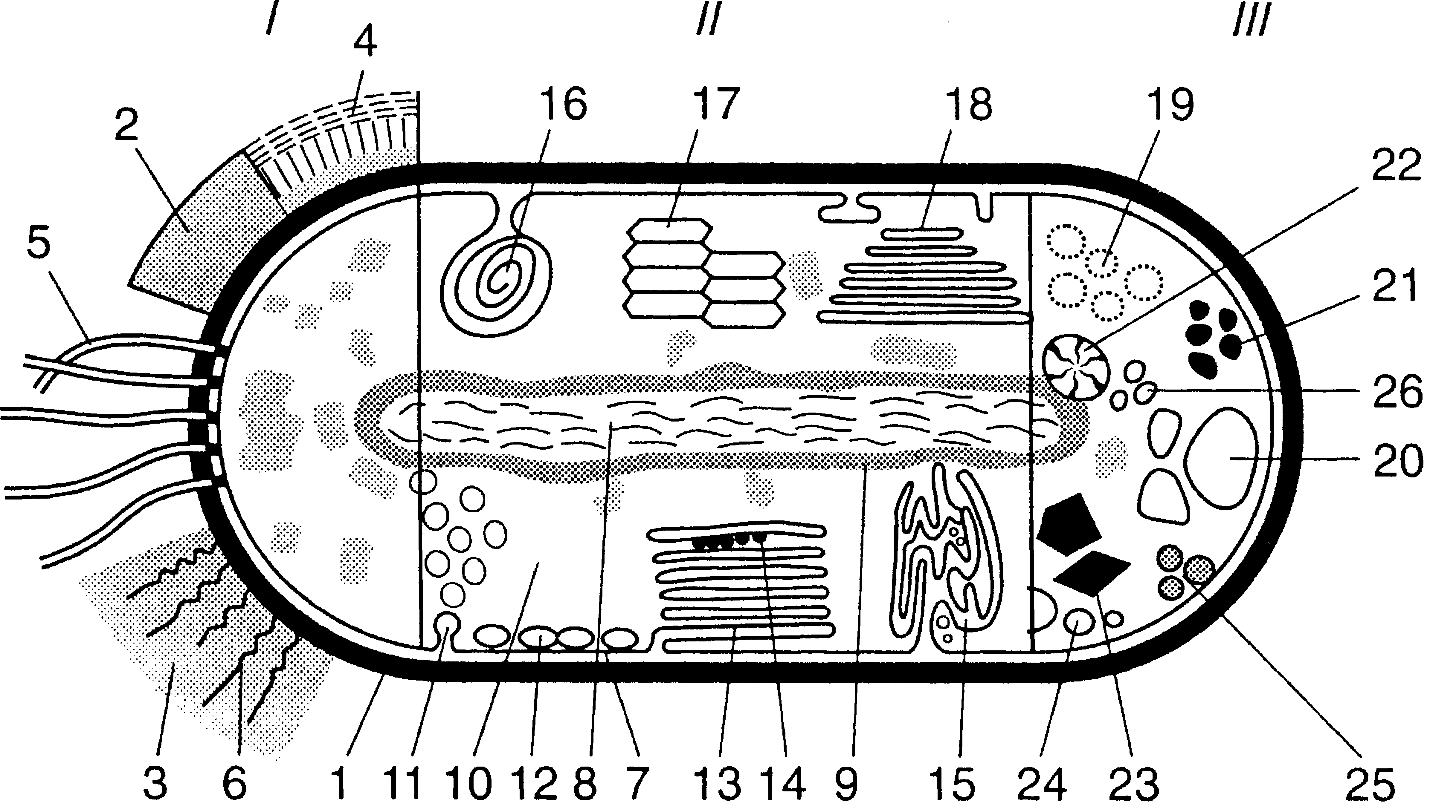 ІІ — цитоплазматичні клітинні структури: 7 — цитоплазматична мембрана; 8 — нуклеоїд; 9 — рибосоми; 10 — цитоплазма; 11 — хроматофори; 72 — хлоросоми; ЇЗ — пластинчасті тилакоїди; 14 — фікобілісоми; 15 — трубчасті тилакоїди; 16 — мезосома; 17 — аеросома (газова вакуоля); 18 — ламелярні структури.