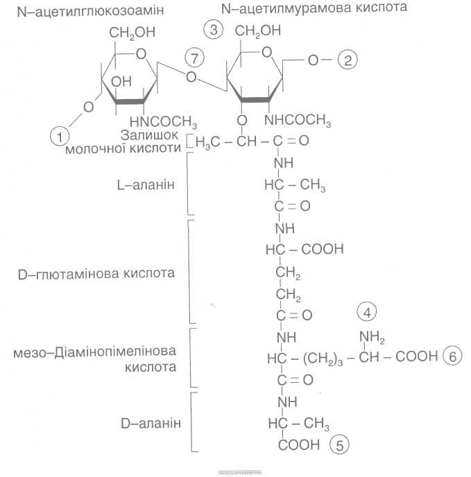 Цифри в кільцях позначають: 1,2 — місця полімеризації гліканового скелета молекули; 3 - місце приєднання за допомогою фосфодіефірпого зв'язку молекули тейхоєвої кислоти в клітинній стінці грампозитивних бактерій; 4, 5 - місця, де відбуваються зв'язування між глікановими ланцюгами за допомогою пептидних зв'язків; 6 - місце ковалентного зв'язування з ліпонротеіном зовнішньої мембрани у грамнегативних бактерій; 7— місце дії лізоциму