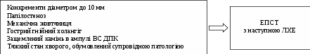 Показаннями до виконання ЛХЕ у поєднанні з післяопераційною ЕПСТ були: тяжкий стан хворого, обумовлений запальним процесом жовчного міхура, що потребує невідкладного втручання; виражені запально-інфільтративні зміни в зоні печінково-дванадцятипалої зв’язки і міхурової протоки; діаметр загальної жовчної протоки менше 10 мм.