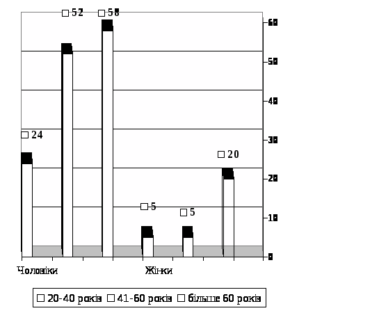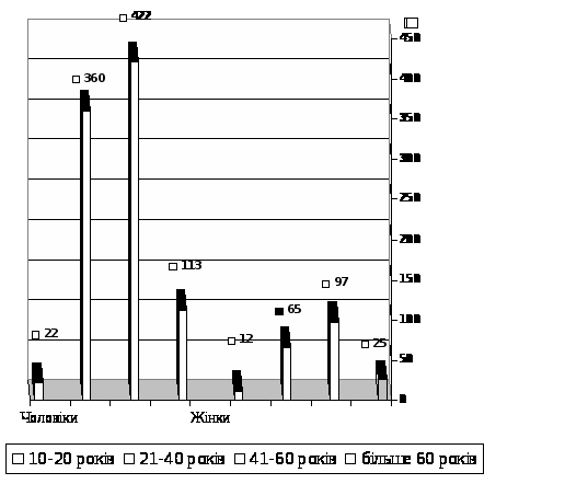 Вивчення показників смертності внаслідок захворювань системи кровообігу серед населення Луганської області за останні 5 років (2002-2006 р.р.) дозволило встановити такі ж самі тенденції демографічних зрушень, як і серед мешканців м. Луганська. Серед померлих від причин ненасильницької смерті у 11161 (79,98%) випадків смерть настала від ІХС, та інших форм захворювань системи кровообігу. Із них 8527 (76,39%) були чоловіки, 2634 (23,61%) - жінки. Кількість померлих від захворювань системи кровообігу, та зокрема від ІХС - збільшилась у 1,5 рази. Загальна кількість померлих від ХІХС - 8028 (71,92%). З них 6149 (76,59%) чоловіків і 1879 (23,41%) жінок. У разі смерті внаслідок гострої ішемічної хвороби серця (ГІХС) померло 1116 (9,55%) осіб. Серед них: 917 (82%) чоловіків і 199 (18%) жінок. За віковими групами серед чоловіків померлі особи були розподілені таким чином: віком до 20 років - 22 випадки; 21-40 років – 360 випадків; від 41-60 років – 422 випадки; від 60 років і більше – 113 випадків. Серед жінок: віком до 20 років – 12 випадків; 21-40 років – 65 випадків; від 41-60 років – 97 випадків; від 60 років і більше – 25 випадків (рис. 2).