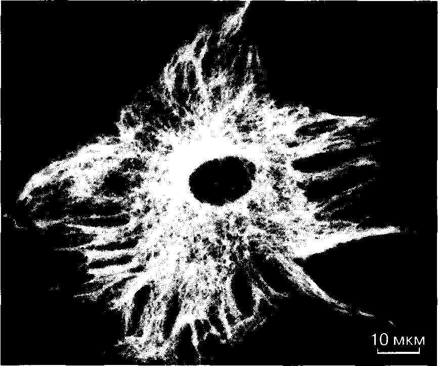 Рис. 2. Иммунофлуоресцентное окрашивание клетки соединительной ткани (фибробласта) моноклональным антителом к тубулину - белку микротрубочек, образующих скелет клетки.