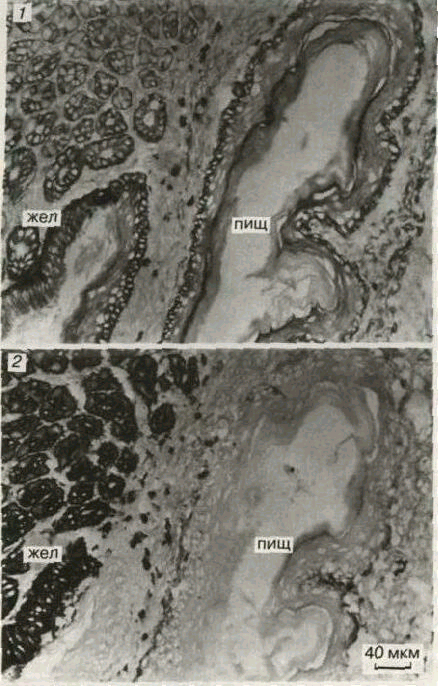Рис. 3. Последовательные срезы через желудок (жел) и пищевод (пищ) мыши, окрашенные двумя моноклональными антителами: 1 - первое моноклональное антитело реагирует с эпителием пищевода и слабее с эпителием желудка; 2 - второе моноклональное антитело реагирует только с эпителием желудка.