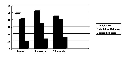Рис.6. Розподіл мієлінових волокон залежно від значень площ їх поперечних зрізів у контрольній групі. По осі абсцис – терміни досліджень, по осі ординат – кількість волокон у %