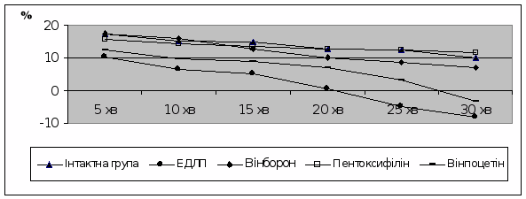 Рис.1. Динаміка об’ємної швидкості мозкового кровотоку при ЕДЛП та її фармакокорекції.