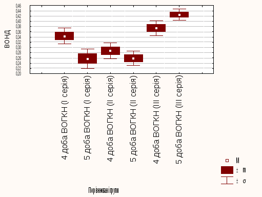 Оскільки четверта та п’ята доба після створення моделі високої обтураційної ГКН є критичними, такими, що визначають прогноз захворювання, нами детально проаналізовано для порівняння кожен морфометричний показник на цей строк у тварин трьох серій. При порівнянні показників ВОПД та ВОНД відмічено, що найбільше пошкоджених ділянок і найменше непошкоджених мали тварини першої та другої серій досліду на п’яту добу після створення моделі високої обтураційної ГКН. Найкращі показники ВОПД та ВОНД (рис. 1) були у тварин третьої серії досліду на п’яту добу (друга доба після хірургічного лікування з застосуванням ентеродетоксикації сорбентом Силлардом П).