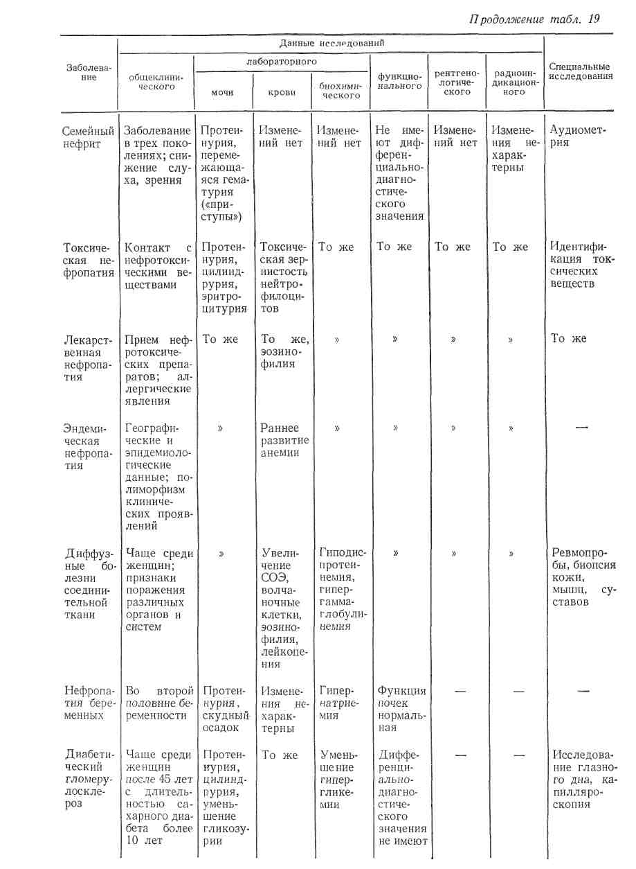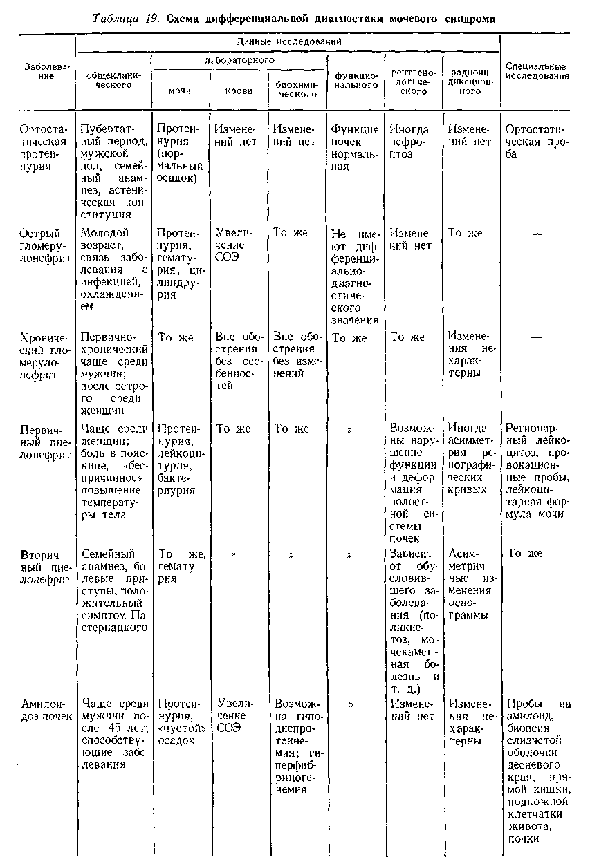 Трудности в дифференциальной диагностике мочевого синдрома возникают главным образом тогда, когда он является единственным проявлением патологического процесса. В табл. 19 приведена дифференциальная диагностика мочевого синдрома при наиболее распространенных заболеваниях.