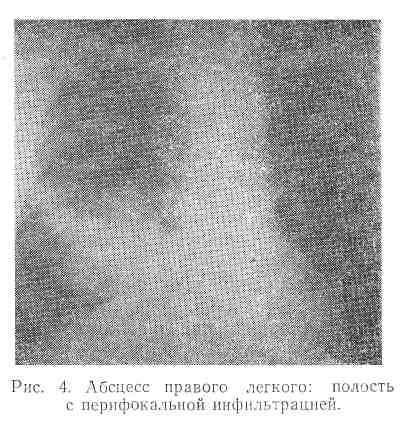 Такой характер нагноительных заболеваний легких соответствует классическому представлению об абсцессе легкого как об ограниченном скоплении гноя, в котором, по С. И. Спасокукоцкому, различают гнойное содержимое, округлую полость и более или менее оформленную стенку. А. А. Опокин применил к таким процессам термин «простой абсцесс», а рентгенологическое описание его впервые дал Ридер в 1906 г.
