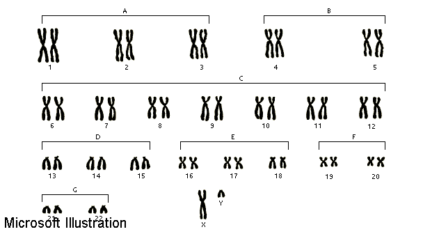 Совокупность хромосом ядра, их число, форма и структура называется кариотипом. У человека кариотип 2n=46 был установлен в 1956г. двумя учёными: Дж. Тийо и А. Леваном. Кариотип человека изображают в виде идеограммы – схемы, на которой хромосомы располагают в ряд по мере убывания их длинны, и по одной из каждой пары. Все хромосомы объединены в 7 групп, обозначаемых буквами римского алфавита. Распределены хромосомы на идеограмме с учётом размеров хромосом и локализации центромерного участка, и каждая хромосома имеет свой номер (арабская цифра).