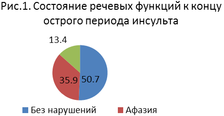 По данным Регистра инсульта НИИ неврологии РАМН, к концу острого инсульта афазия наблюдалась у 35,9%, дизартрия у 13,4% больных (рис.1)