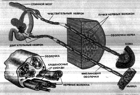 Нервы – скопления длинных отростков нервных клеток, покрытых оболочкой. Нервы, состоящие из аксонов двигательных нейронов, называются двигательными нервами. Чувствительные нервы состоят из дендритов чувствительных нейронов. Большинство нервов содержат и аксоны и детриты. Такие нервы называют смешанными. По ним импульсы идут по двум направлениям – к центральной нервной системе и от нее к органам.
