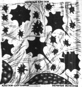 Клетки-спутники окружают нейроны, выполняя питательную, опорную и защитную функции. Клеток –спутников примерно в 10 раз больше, чем нейронов.