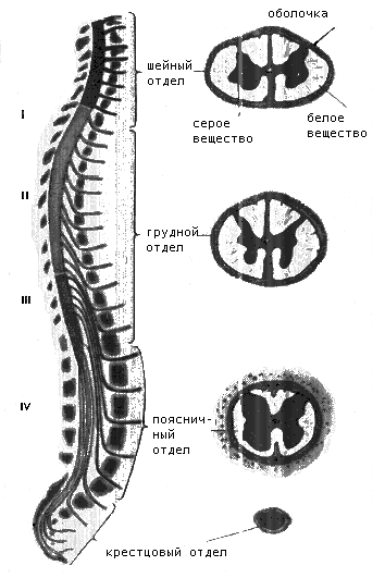 Центральная часть спинного мозга образована серым веществом, которое состоит из вставочных и двигательных нейронов. Вокруг серого вещества расположено белое вещество, образовано длинными отростками нейронов. Они направляются вверх или вниз вдоль спинного мозга, образуя восходящие и нисходящие проводящие пути.