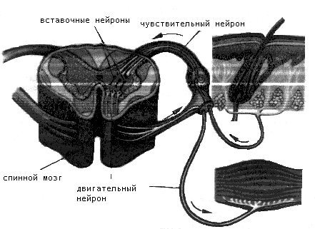 Рефлекторная дуга начинается рецептором. Каждый рецептор воспринимает определенный раздражитель: свет, звук, прикосновение, запах, температуру и др. Рецепторы преобразуют эти раздражители в нервные импульсы – сигналы нервной системы. Нервные импульсы имеют электрическую природу, распространяются по мембранам длинных отростков нейронов и одинаковы у животных и человека. От рецептора нервные импульсы по чувствительному пути передаются в центральную нервную систему. Этот путь образован чувствительным нейроном. От центральной нервной системы импульсы по двигательному пути идут к рабочему органу. В состав большинства рефлекторных дуг входят и вставочные нейроны, которые находятся как в спинном, так и в головном мозге.