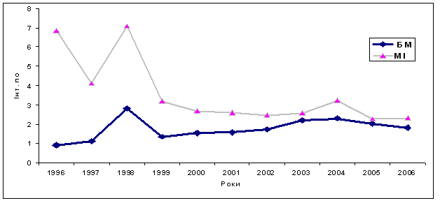 1. Епідемічний процес бактеріальних менінгітів у м. Києві, як прикладу урбанізованого мегаполісу, характеризувався протягом 1996–2006 рр. спорадичною захворюваністю (40–80 випадків на рік) із показниками від 0,9 до 2,8 на 100 тисяч населення; превалюванням у віковій структурі захворюваності дитячого населення − від 54,3 до 77,0% всіх випадків; вираженою зимово-весняною сезонністю; періодичними підйомами захворюваності на Ніb-менінгіти кожні 3–4 роки.