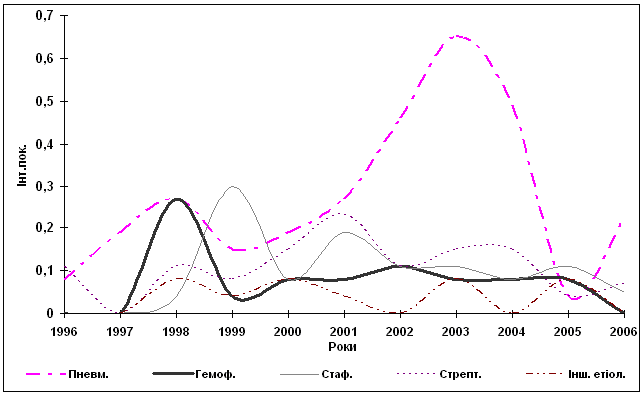 Особистий внесок – дисертантом проаналізовано статистичні дані щодо захворюваності на бактеріальні менінгіти, їх етіологічну структуру; менінгококову інфекцію; Hib-менінгіти в м. Києві за період з 1991 по 2004 рік.