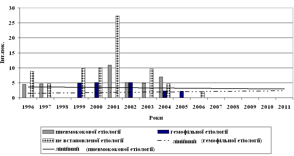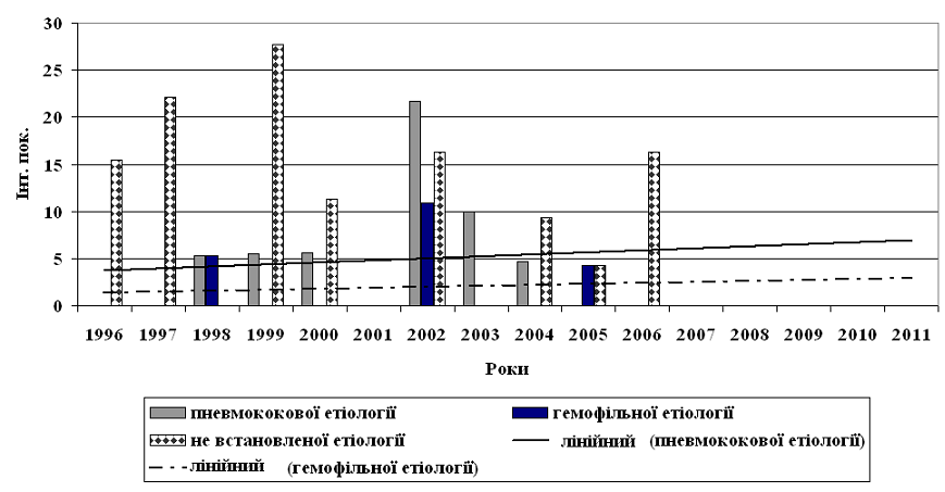 2. Встановлено, що протягом десятирічного періоду спостереження в етіології бактеріальних менінгітів у дорослих переважали менінгококи, пневмококи, стафілококи та стрептококи, а у дітей − менінгококи, пневмококи та Ніb. Показники захворюваності на Ніb-менінгіти серед дітей до 1 року складали 4,3–10,9; 1–2 років − 2,2–5,1; 3–6 років − 0,9–4,1 та 7–14 років − 0,3 випадків на 100 тис. дітей відповідної вікової групи. Групою ризику щодо розвитку Ніb-менінгітів є діти віком 0–2 роки.