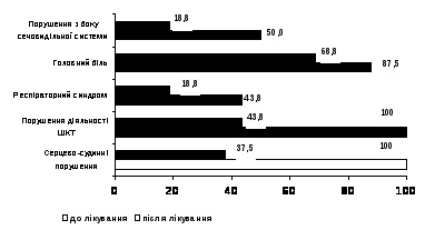 Серед клінічних проявів ВСД переважали синдром порушення збудливості міокарда (тахі-, брадиаритмія, екстрасистолія, прискорення атріовентрикулярної провідності) – 87,1%; гіперкінетичний синдром (артеріальна гіпертензія, збільшення ударного об’єму крові) – 45,2%. Рідше спостерігались синдроми скоротливої дисфункції міокарда (кардіалгії, артеріальна гіпотензія) – 36,0%; тонічної дисфункції міокарда (пролапс мітрального клапана, порушення тонусу папілярних та хордальних м’язів) – 15,1% та міокардіодистрофічний – 15,6% пацієнтів.