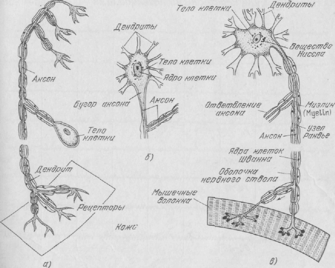 Рис. 12. Схематическое изображение трех различных типов нейронов: а) — спинальный сенсорный нейрон; б) — ассоциативный нейрон; в) — спинальный двигательный нейрон.