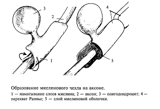 Возбуждение в виде потенциала действия покидает тело нейрона по его отростку, который называется аксоном. Аксоны отдельных нейронов обычно объединяются в пучки - нервы, а сами аксоны в этих пучках называются нервными волокнами. Природа позаботилась, чтобы волокна максимально хорошо справлялись с функцией проведения возбуждения в виде потенциалов действия. Для этой цели отдельные нервные волокна (аксоны отдельных нейронов) имеют специальные чехлы, выполненные из хорошего электрического изолятора (см. рис. 1). Чехол прерывается примерно через каждые 0,5-1,5 мм; это связано с тем, что отдельные участки чехла образуются в результате того, что специальные клетки в очень ранний период развития организма (в основном еще до рождения) обволакивают небольшие участки аксона. На рис.7 показано, как это происходит. В периферических нервах миелин образуется клетками, которые получили название шванновских, а в головном мозге это происходит за счет клеток олигодендроглии.