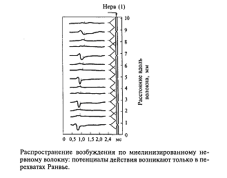 У млекопитающих животных природа сохранила немиелинизированными только те возбуждение о боли, температуре, управляют медленно работающими внутренними органами мочевым волокна, которые проводят органами - мочевым пузырем, кишечником и пр. Практически все нервные волокна в центральной нервной системе человека имеют миелиновые чехлы. На рис.9 показано, что если вдоль волокна, покрытого миелином, регистрировать прохождение возбуждения, то потенциал действия возникает только в перехватах Ранвье. Оказывается, миелин, являясь хорошим электрическим изолятором, не пропускает выхода линий тока от предшествующего возбужденного участка. Выход тока в этом случае возможен только через те участки мембраны, которые находятся на стыке между двумя участками миелина. Напомним, что каждый участок образован только одной клеткой, поэтому это стыки между двумя клетками, образующими соседние участки миелиновой оболочки. Мембрана аксона между двумя соседними миелиновыми чехлами оказывается не покрытой миелином (так называемый перехват Ранвье). Благодаря такому устройству мембрана волокна возбуждается только в местах перехватов Ранвье. Вследствие этого потенциал действия (возбуждение) как бы перескакивает через участки изолированной мембраны. Другими словами, возбуждение движется скачками от перехвата к перехвату. Это похоже на те волшебные сапоги-скороходы, которые надевал кот в известной сказке, мгновенно переносясь из одного места в другое.