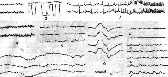 Рис. 17. Основные типы артефактов на ЭЭГ: 1 — сетевая наводка; 2 — движение электрода на втором канала; 3 — от фотостимулятора; 4 — ЭМГ; 5— ЭКГ (верхний канал) и РГ (нижний канал); 6 — глотательное движение; 7— КГР; 8 — ЭОГ, наиболее выраженный в лобных отведениях.