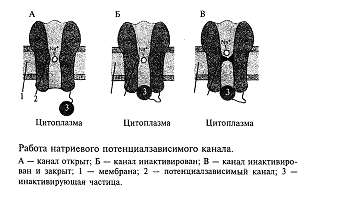Все изложенное выше можно формально описать следующим образом. В покое клетка ведет себя как «калиевый электрод», а при возбуждении - как «натриевый электрод». Однако после того как потенциал на мембране достигнет своего максимального значения +55 мВ, натриевый ионный канал со стороны, обращенной в цитоплазму, закупоривается специальной белковой молекулой. Это так называемая «натриевая инактивация» (см. рис.4); она наступает примерно через 0,5-1 мс и не зависит от потенциала на мембране. Мембрана становится непроницаемой для натриевых ионов. Для того чтобы потенциал мембраны вернулся к исходному состоянию-состоянию покоя, необходимо, чтобы из клетки выходил ток положительных частиц. Такими частицами в нейронах являются ионы калия. Они начинают выходить через открытые калиевые каналы. Вспомните, что в клетке в состоянии покоя накапливаются ионы калия, поэтому при открывании калиевых каналов эти ионы покидают нейрон, возвращая мембранный потенциал к исходному уровню (уровню покоя). В результате этих процессов мембрана нейрона возвращается к состоянию покоя (-70 мВ) и нейрон готовится к следующему акту возбуждения.
