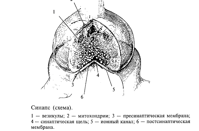 Как передается возбуждение от одного нейрона другому или от нейрона, например, на мышечное волокно? Этой проблемой интересуются не только профессиональные нейробиологи, но и врачи, особенно фармакологи. Знание биологических механизмов необходимо для лечения некоторых заболеваний, а также для создания новых лекарств и препаратов. Дело в том, что одними из основных мест воздействия этих веществ на организм человека являются места передачи возбуждения с одного нейрона на другой (или на другую клетку, например клетку сердечной мышцы, стенки сосудов и пр.). Отросток нейрона аксон направляется к другому нейрону и образует на нем контакт, который называют синапсом (в переводе с греческого - контакт; см. рис. 1). Именно синапс хранит многие тайны мозга. Нарушение этого контакта, например, веществами, блокирующими его работу, приводит к тяжелейшим последствиям для человека. Это место приложения действия наркотиков. Примеры будут приведены ниже, а сейчас рассмотрим, как устроен и как работает синапс.