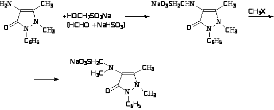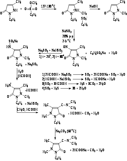 Водную суспензию соли антипирина передавливают в нейтрализатор, охлаждают до 20 оС и постепенно приливают 20%-раствор NaNO>2>. Температура реакции не должна превышать 4-5 оС. Полученную суспензию изумрудно-зеленые кристаллы нитрозоантипирина и промывают холодной водой. Кристаллы загружают в реактор, куда добавляют бисульфитно-сульфатную смесь. Смесь сначала выдерживают 3 ч. при 22-285оС, затем 2-2,5 ч. при 80 оС. раствор натриевой соли передавливают в гидролизатор. Получают гидролизат аминоантипирина, который подвергают метилированию в реакторе смесью формальдегида и муравьиной кислоты. Выделяют амидопирин из муравьинокислой соли, обработкой раствора соли при 50 оС раствором соды. После нейтрализации амидопирин всплывает в виде масла. Отделяют масляный слой и переводят его в нейтрализатор, где перекристаллизовывают из изопропилового спирта.