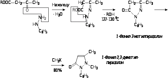 Стремясь получить тетрагидрохинолиновые соединения, обладающие жаропонижающими свойствами хинина Кнорр в 1883 г. осуществил конденсацию ацетоуксусного эфира с фенилгидрозином, который проявляет слабое жаропонижающее действие, плохо растворим в воде; метилирование его привело к получению высокоактивного и хорошо растворимого препарата 1-фенил-2,3-диметилпирозолона (антипирина).