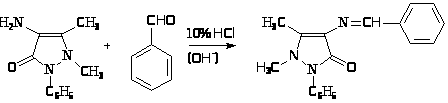 Очистка аминоантипирина и выделение его из различных растворов осуществляется через бензилиденовое производное (светложелтые, блестящие кристаллы, t>пл> 172-173 оС), легко образуется при взаимодействии аминоантипирина с бензальдегидом:
