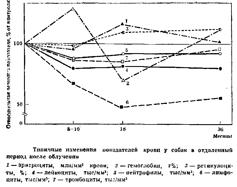 которых облучали в дозе 4,5 Гр (ЛД 50/30), восстановление гемопоэза происходило медленно. Быстрее всего восстанавливалось число эритроцитов. С 75-го дня после облучения их количество начинало превышать исходный уровень или равнялось ему. Число лейкоцитов за весь годовой период наблюдений не достигало исходных величин. Восстановление числа лимфоцитов шло наиболее замедленными темпами, и в последние месяцы эксперимента лимфоцитов в среднем оказалось в 2 раза ниже исходного уровня. Содержание тромбоцитов было значительно снижено — в большинстве случаев больше, чем нейтрофилов. Число тромбоцитов достигло уровня 90% исходной величины лишь на 12-м месяце. При исследовании костного мозга на 4-м и 10-м месяце отношение клеток миелоидного ряда к клеткам эритроидного ряда было смещено в сторону красного ряда.
