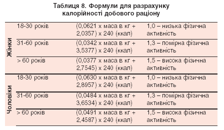 Розрахунок калорійності добового раціону здійснюється за формулами, поданими в таблиці.