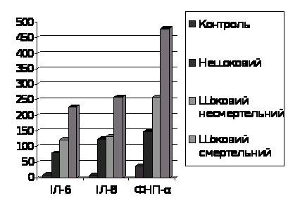 Концентрація цитокінів в сироватці крові зростала, зберігаючи тенденцію зростання від не шокового (мінімальна) до шокового смертельного (максимальна) типу посттравматичної реакції. Концентрація ІЛ-6 збільшувалася в 7,9 разів при нешоковому типі, в 12,3 разів - при нешоковому смертельному і в 22,9 разів - при шоковому типі посттравматичної реакції. Концентрація ІЛ-8 змінювалася сильніше: у 16.0, 17,0 і 20,9 разів відповідно згаданих типів посттравматичної реакції. Ступінь зміни ФНП-б була, в порівнянні з іншими цитокіни, меншою. Так при нешоковому типі концентрація ФНП-б була в 3,9 рази, при шоковому несмертельному – в 6,8 раз, а при шоковому смертельному – в 12,5 раз більшою, ніж в контролі.
