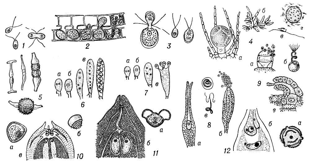 Рис. 1. Оплодотворение у растений: 1 — изогамия у хламидомонады Рейнхардта; 2 — конъюгация у спирогиры; 3 — гетерогамия у хламидомонады Брауна; 4 — оогамия у фукуса: а — оогоний, б — группа антеридиев, в — сперматозоид, г — сперматозоиды близ яйцеклетки; 5 — зигогамия у мукора; 6 — дикарион (а), диплоидное ядро (б) и образование спор (в) в сумке сумчатого гриба; 7 — дикарион (а) и диплоидное ядро (б) в базидии и образование спор (в) у базидиального гриба; 8 — вскрывшийся архегоний (а), выход сперматозоидов из антеридия (б) и сперматозоиды (в) у зелёных мхов; 9 — выход сперматозоидов из антеридия (а), сперматозоид (б) и вскрывшийся архегоний (в) у равноспоровых папоротников; 10 — пыльцевое зерно (а), сперматозоид (б) и часть семезачатка саговника (в), в котором видны часть женского заростка с архегониями и мужские заростки, выдающиеся в архегониальную камеру; 11 — пыльцевое зерно (а) и часть семезачатка сосны (б), где видны часть женского заростка с архегониями и пыльцевая трубка со спермиями; 12 — пыльцевое зерно (а) и часть зародышевого мешка покрытосеменного растения (б): ядро одного спермия находится близ ядра яйцеклетки, а ядро другого — близ вторичного ядра зародышевого мешка.
