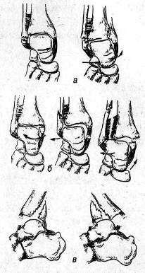 Переломы таранной кости (рис. 33). Механизм перелома, как правило, непрямой — падение с высоты на ноги, резкое торможение автомашины при упоре ступнями в ее пол или рычаги управления и т. д.