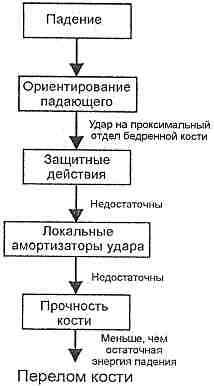 Более чем 90% переломов проксимального отдела бедренной кости возникают после падений с высоты, не превышающей рост человека. Любое падение состоит из четырех различных фаз: фазы нарушения равновесия; фазы падения; фазы удара и фазы, следующей за ударом, во время которой упавший возвращается в исходное положение. Ранее проведенные исследования падений у пожилых были направлены почти исключительно на изучение первой фазы, то есть тех факторов (внутренних и внешних), которые вызывают утрату равновесия. Подчеркивалось значение нарушений походки, деменции, нарушений зрения, изменений со стороны нервной системы и опорно-двигательного аппарата, ортостатической гипотензии, лекарственной терапий и опасностей со стороны окружающей среды.