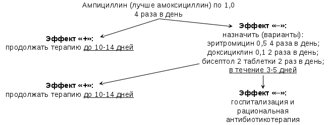 во всех случаях антибиотикотерапия должна продолжаться не менее 5 дней и до тех пор, пока не удастся добиться нормализации температуры на протяжении 48 часов;