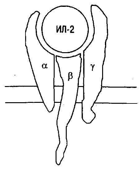 Рецептор для ИЛ-2 (ИЛ-2Р) состоит из трех полипептидных цепей, которые могут быть экспрессированы как вместе, так и по отдельности (рис. 12). В зависимости от того, из скольких цепей будет составлен рецептор, изменяется его аффинность. Так, при экспрессии только одной -цепи (молекулярная масса 55 000) рецептор обладает наиболее низкой аффинностью с константой диссоциации (К>d>) около 10 нМ. Такой рецептор, обозначаемый иногда как ТАС-антиген, имеет очень небольшую цитоплазматическую часть и после связывания ИЛ-2 не способен проводить сигнал внутрь клетки. При изолированной экспрессии -цепи (молекулярная масса 75 000) формируется рецептор средней аффинности (К>d> около 1 нМ). Такой рецептор при наличии достаточно высоких концентраций ИЛ-2 способен проводить сигнал. Есть основания полагать, что р-цепь экспрессируется вместе с -цепью (молекулярная масса 64 000), так как для проведения сигнала требуется гетеродимеризация цитоплазматических доменов - и -цепей. При совместной экспрессии всех трех цепей формируется рецептор высокой аффинности (К>d> около 10 пкМ).