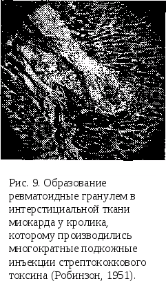 с фибринным сгустком добавлялось к солевому раствору (0,1 молярная лимонная кислота— 12.7 мл, 0,2 молярный двузамещенный фосфат натрия — 187,3 мл, дистиллированной воды — 750 мл, сульфата магне-HIIH - 1,0, глюкозы — 1,0, поваренной соли — 2,5 г, азотнокислого калия — 0,5 г, аскорбиновой кислоты — 0,1 г, тиамина - 0,01 г, печеночного экстракта — 2,0 мл), предварительно пропущенному через фильтр Зейтца. Смесь инкубировалась при температуре 37°С в течение 24—36 часов и, когда чистая культура стрептококка накапливалась в достаточном количестве, фильтровалась через фильтр Зейтца. Токсин вводился молодым белым кроликам 2 раза каждые 24 часа н количестве 3 мл. Опыт продолжался в течение 10—65 дней. У животных повышалась температура, ухудшался аппетит, они становились вялыми. Значительные изменения обнаруживались со стороны сердца. В эндокарде имело место набухание соединительной ткани, хондромукоидный отек и образование гранулем с большим количеством крупных клеток, миоцитов Аничкова и лимфоидных элементов (рис. 9). Аналогичные изменения наблюдались в стенке артерий и в соединительнотканных прослойках миокарда.