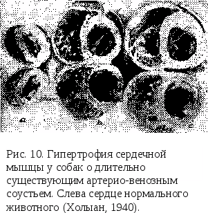 Гипертрофия миокарда, развивающаяся у животных под влиянием пониженного барометрического давления. Хайман и др. (1949) помещали крыс ежедневно на 4 часа в камеру с пониженным атмосферным давлением («подъем» на высоту 7620 м). Опыт продолжался в течение 100—200 дней. Одной из наиболее постоянных находок на вскрытии являлась гипертрофия сердца. Она была значительной у всех животных. При гистологическом исследовании обнаружена гипертрофия мышечных волокон, жировая дистрофия их и множественные мелкие и крупные рубцы.