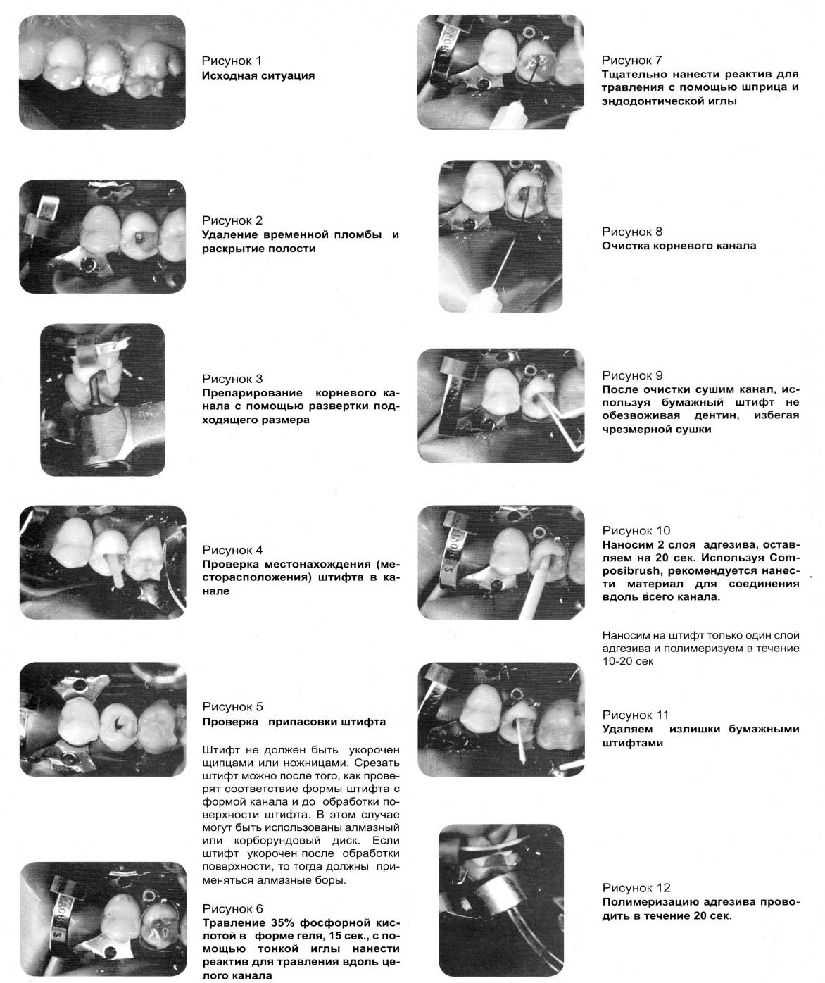 Возможна повторная установка того же штифта, если его удалось целиком или возможна установка нового штифта. В любом случае остатки цемента должны быть удалены дрилем соответствующего размера, после чего врач повторяет процедуру нанесения адгезива.