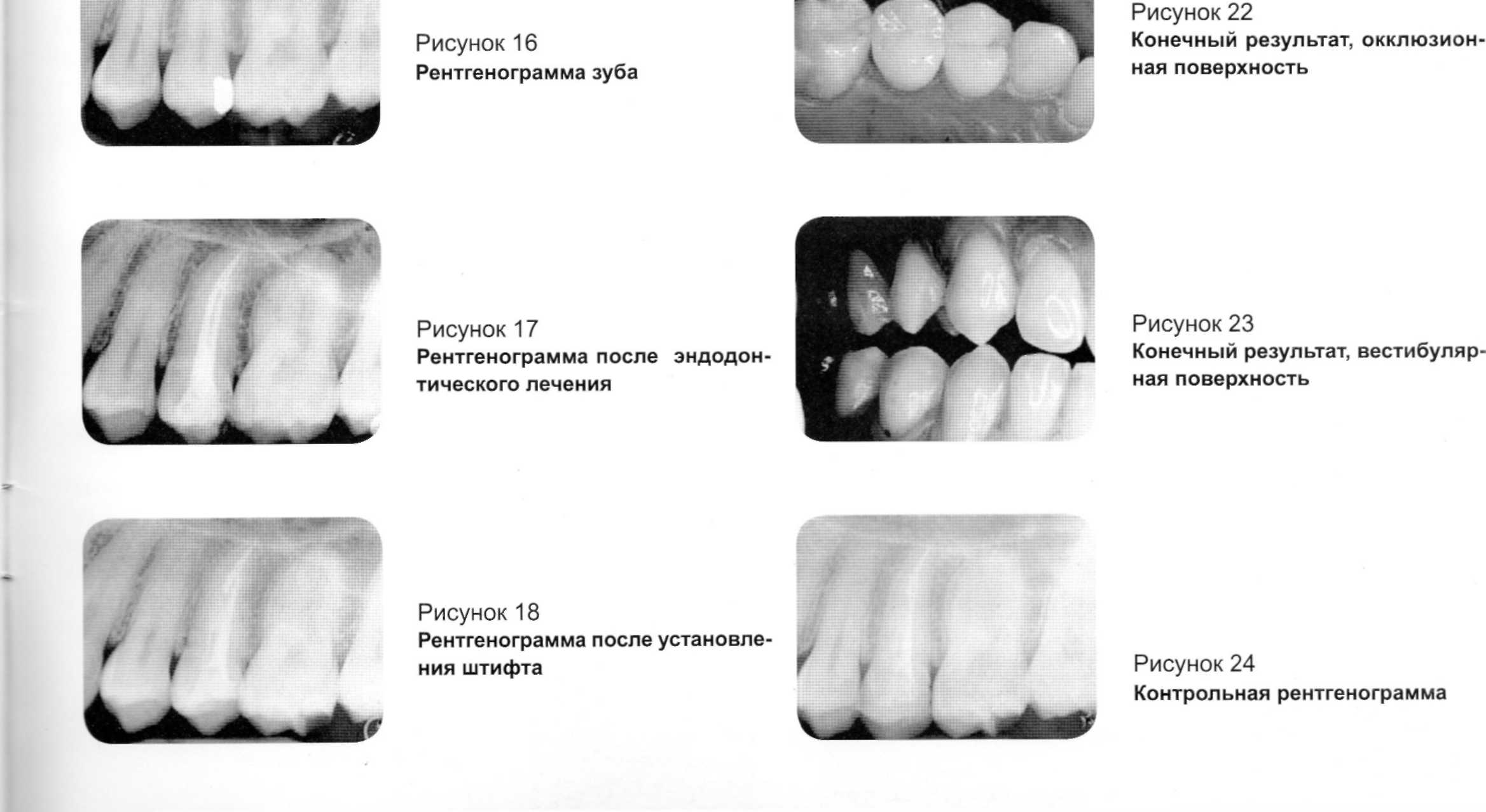 Клинический опыт говорит в пользу текучих композитов, морфологические исследования высказываются в пользу микрогибридных. Наши клинические результаты положительны в отношении всех видов композитов. Таким образом, если врач отдает предпочтение какой-либо методике или материалу, он может руководствоваться данными о коронарной адаптации материала к оставшимся тканям зуба или корня. Так, например, X-Flow (Dentsply DeTrey), демонстрирует очень хорошую адаптацию к поверхности штифта и при моделировании культи.