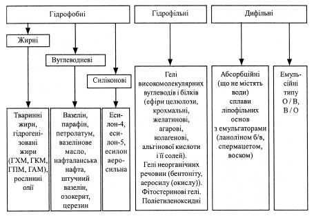 В основу класифікації повинна бути покладена найбільш характерна ознака, що дозволяє об'єднати речовини в єдину, органічно зв'язану групу. Така характерна ознака для всіх речовин чи композицій основ -їх здатність взаємодіяти з водою. По інтенсивності взаємодії з водою всі основи поділяють на три групи: гідрофобні, гідрофільні та дифільні. Така класифікація вважається найбільш раціональною. Вона прийнята ДФ XI.