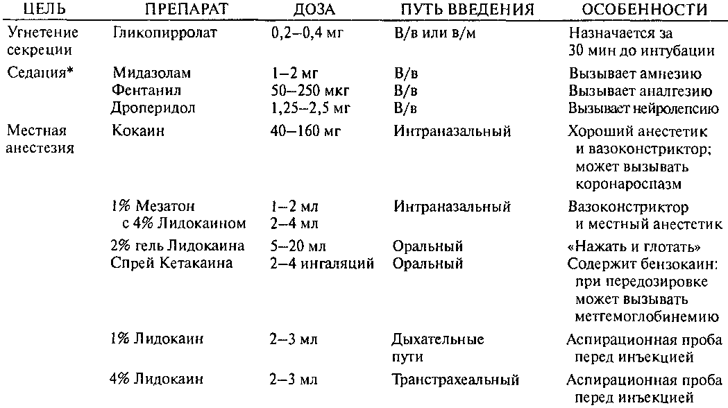 Кроме того, большое значение имеет подготовка рабочего места. Должны быть легко доступны местные анестетики для поверхностной анестезии, внутривенные седативные препараты, набор ротовых и носовых воздуховодов и эндотрахеальных трубок, отсос, волоконно-оптический эндоскоп и другие принадлежности для интубации. Анестезиолог должен составить план проведения интубации и продумать резервный вариант действий. Хирургу, способному в случае реальной угрозы оперативным путем обеспечить проходимость дыхательных путей, следует находиться рядом с больным.