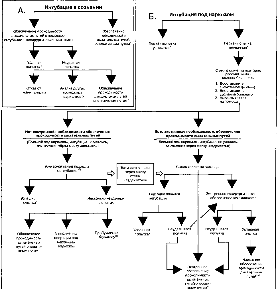 Всегда имеет смысл рассмотреть положительные стороны регионарной анестезии (инфильтрация операционного поля местным анестетиком, блокада нервов, спинальная и эпидуральная анестезия), позволяющей избежать заранее известной или предположительной трудной интубации. Хотя подробный сбор анамнеза и функциональное обследование с высокой вероятностью помогают выявить большую часть больных, у которых могут возникнуть проблемы при обеспечении проходимости дыхательных путей, всегда сохраняется вероятность случайных непредвиденных проблем. Только предварительное планирование и практические алгоритмы помогают эффективно разрешить подобные ситуации. Американское общество анестезиологов разработало алгоритм, помогающий клиницистам при трудной интубации. Ключевое значение имеет умение предвидеть трудную интубацию и вентиляцию. Необходимо сравнить преимущества того или другого подхода (хирургического или нехирургического, интубации в сознании или под общей анестезией, на спонтанном дыхании или со вспомогательной вентиляцией). После принятия решения детально анализируются основная и альтернативная стратегии. Это помогает придерживаться строгой последовательности действий, особенно при продолжающихся трудностях интубации и вентиляции. Алгоритм действий заслуживает подробного и неоднократного изучения перед тем, как анестезиолог попытается решить возникшие проблемы. Это не время для героизма. Если интубация и вентиляция вызывают затруднения — зовите на помощь!