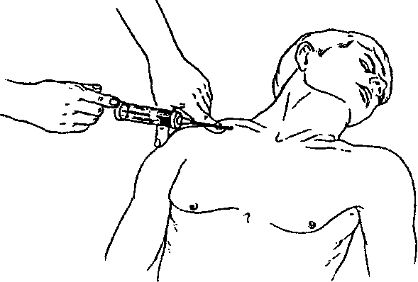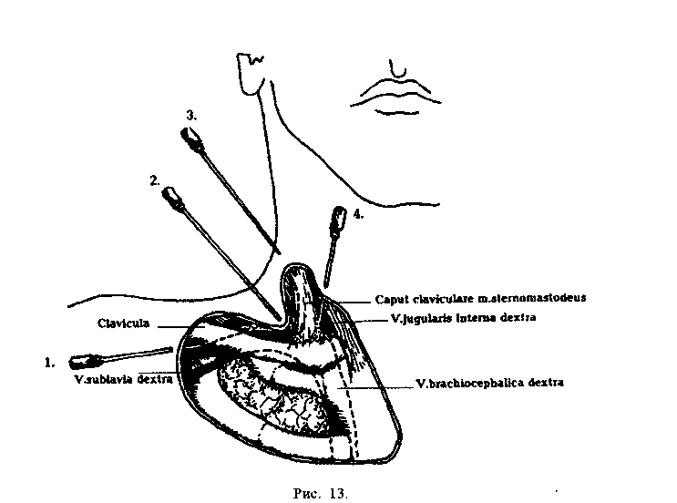 9) у новорожденных и детей младшей возрастной группы кровь появляется в шприце чаще не во время продвижения иглы под ключицу и насасывания, а при последующем медленном ее извлечении с одновременной аспирацией (это объясняется тем, что пункционная игла, особенно недостаточно остро заточенная, у детей в силу податливости тканей легко сдавливает подключичную вену и прокалывает переднюю и заднюю ее стенки, в просвете вены кончик иглы оказывается лишь при медленном ее извлечении из-под ключицы);