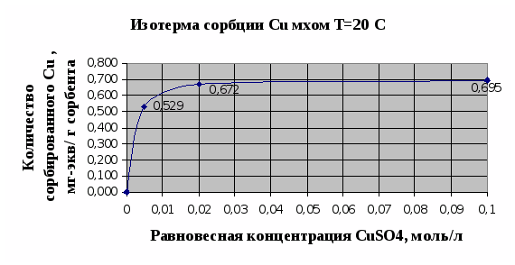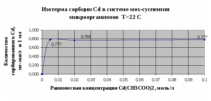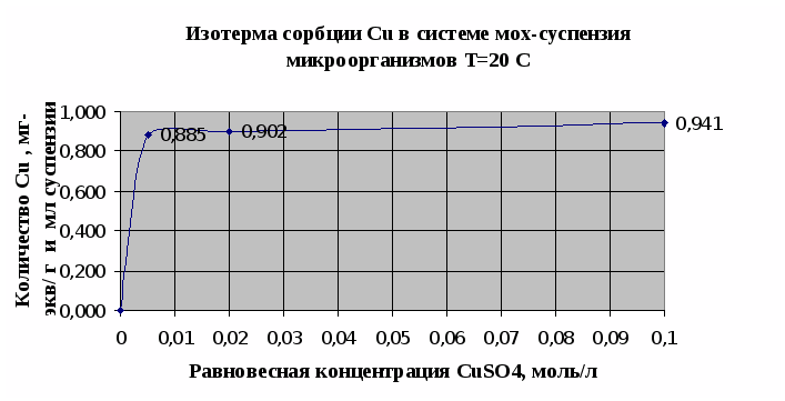 Полученные экспериментальные данные в опыте по изучению сорбции металлов мхом (2.1.3.) сведены в таблицу 2.1. и представлены в виде изотерм сорбции на рисунках 2.1. и 2.2..
