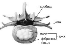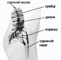 Мал. 1. Хребці, утворені кістковою тканиною, розділені м'якими прокладками - дисками, які амортизують хребці при русі. Спинний мозок проходить через канал, сформований пластинками хребців. Нерви або корінці виходять через отвори з обох боків поперекового відділу хребта.